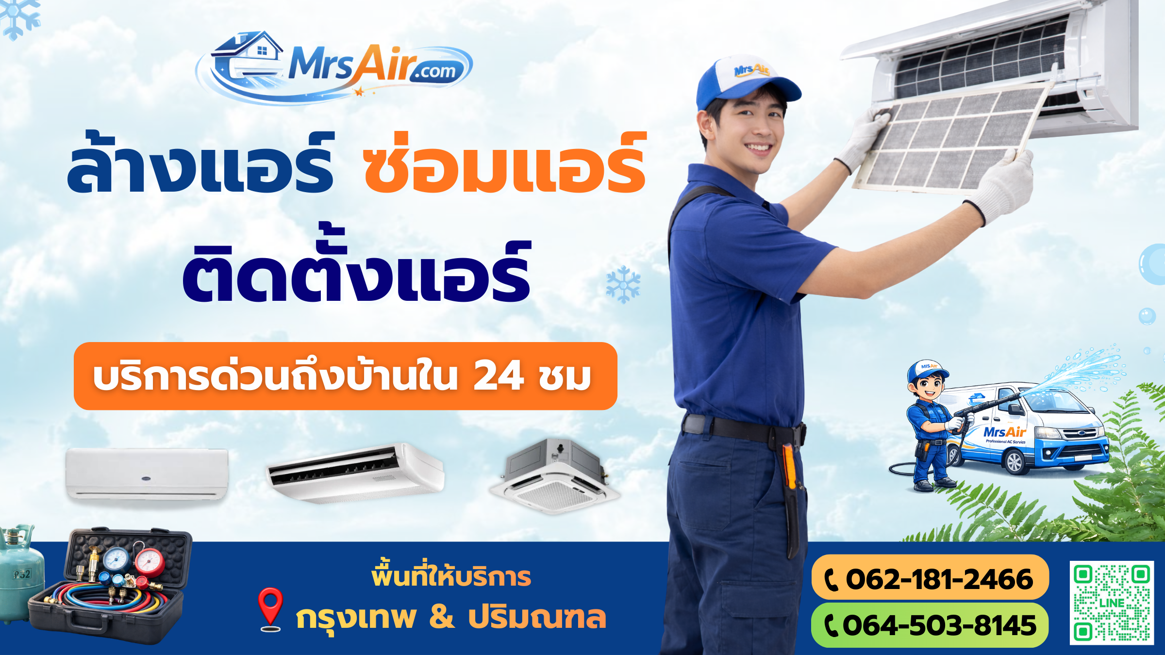 เราพร้อมส่งมอบบริการดูแลแอร์แบบครบวงจร ไม่ว่าจะเป็นงาน ล้างแอร์ฆ่าเชื้อโรค, ตรวจเช็คซ่อมบำรุง, ติดตั้งแอร์ใหม่, เติมน้ำยา หรือย้ายเครื่องปรับอากาศ ดูแลโดยทีมช่างประสบการณ์สูงที่ผ่านการอบรมมาตรฐานความปลอดภัย ครอบคลุมพื้นที่ กรุงเทพมหานครและปริมณฑล ใส่ใจในทุกรายละเอียดของหน้างาน สุภาพ ตรงต่อเวลา บริหารงานอย่างมืออาชีพ และสามารถออกใบกำกับภาษีเต็มรูปแบบได้อย่างถูกต้อง